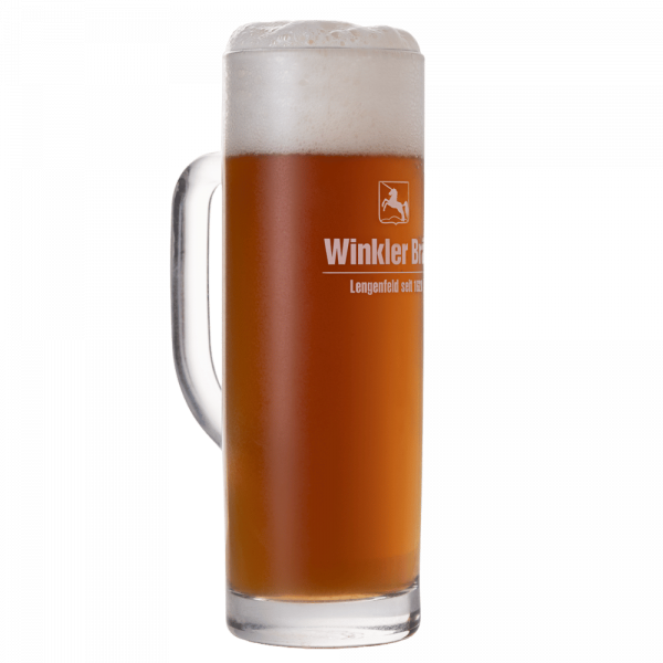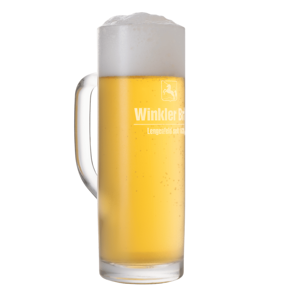 Das klare Glas lässt die goldene Farbe und feine Perlage des Bieres perfekt zur Geltung kommen. Auf der Vorderseite befindet sich das Winkler Bräu Logo mit dem Schriftzug „Lengenfeld seit 1628“, das dem Krug eine authentische, bayerische Note verleiht.